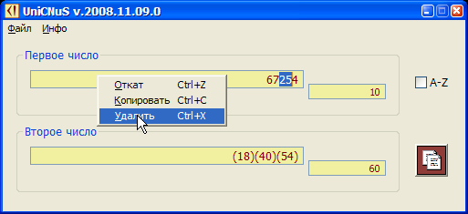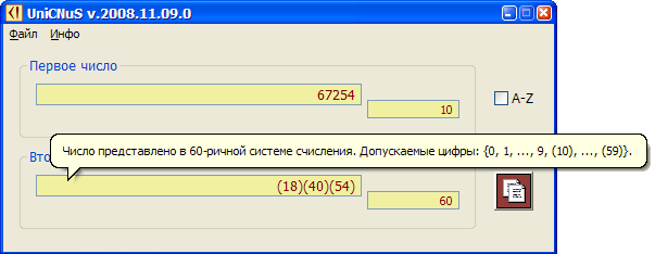 С каждым контролом программы связана всплывающая подсказка (tooltip), которая объясняет его предназначение. Кроме того, с полями редактирования, которые содержат представление числа в разных системах счисления, связаны динамически генерируемые подсказки представляющие набор цифр допускаемых в данной системе счисления: